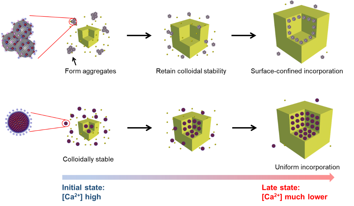 图3. 纳米复合胶体粒子的制备及其在方解石晶体中的内嵌分布。