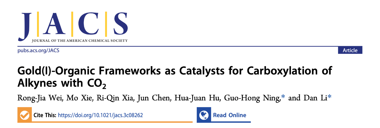 近日,公司超分子配位化学研究所宁国宏教授、李丹教授团队在J. Am. Chem. Soc.上发表了题为“Gold(I)-Organic Frameworks as Catalysts for Carboxylation of Alkynes with CO2”的重要研究成果(图1)。