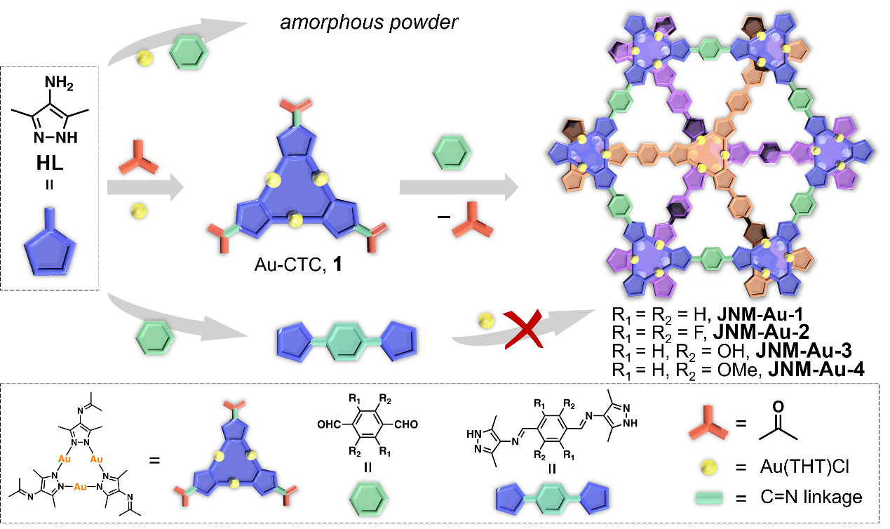 图2. 基于金(I)环三核配合物的金(I)基金属有机框架合成策略。图片来源:J. Am. Chem. Soc.。