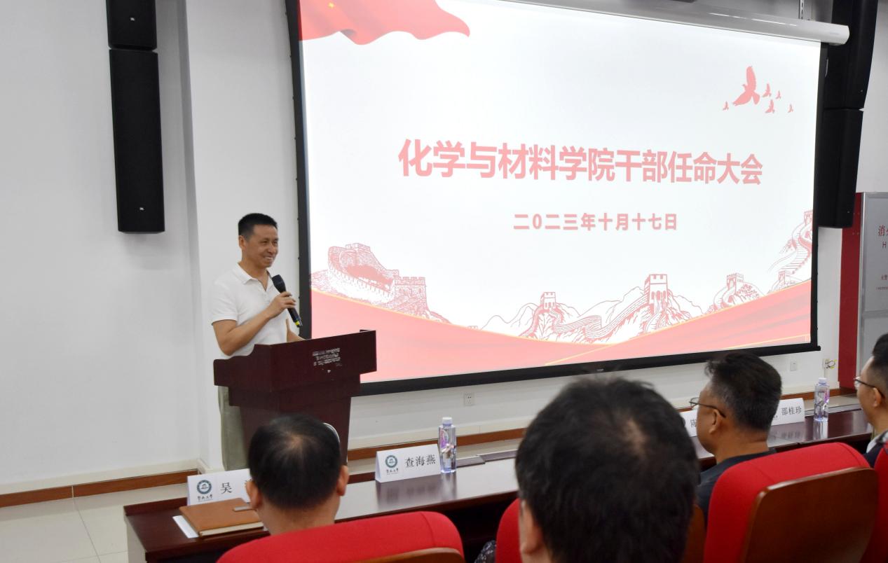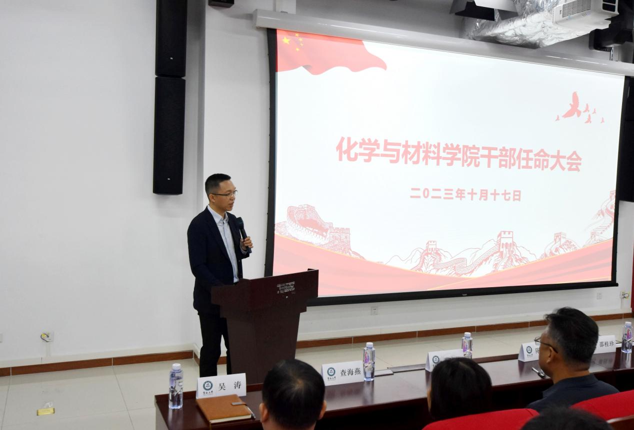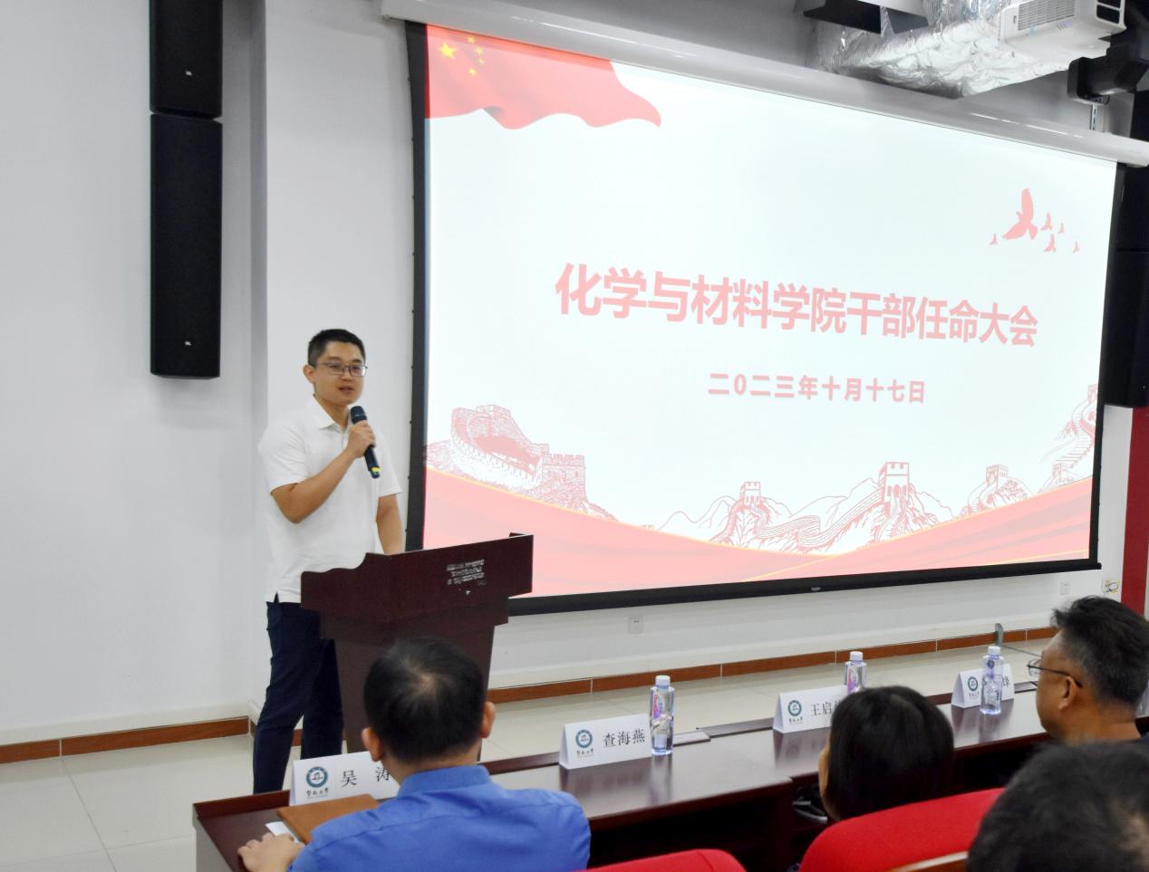 陈填烽同志作表态发言。他表示,感谢公司领导与公司老师的信任,他回顾了上一届领导班子所取得的辉煌成绩,并表示十分荣幸能够肩负起化学与材料公司经理这一重任。未来,他将积极投入工作,从四个方面着手:一是加强政治理论学习,时刻保持政治上的清醒坚定;二是团结一致,凝聚人心,与领导班子一同带领公司阔步向前;三是要务实,着眼公司乃至公司全局,尽职尽责真抓实干;四是要奋进,紧扣球速体育“双一流”学科及相关学科群的发展要求,塑造学科特色,打造新的化学与材料学科高峰,走出一条符合公司自身实际情况的发展路线。