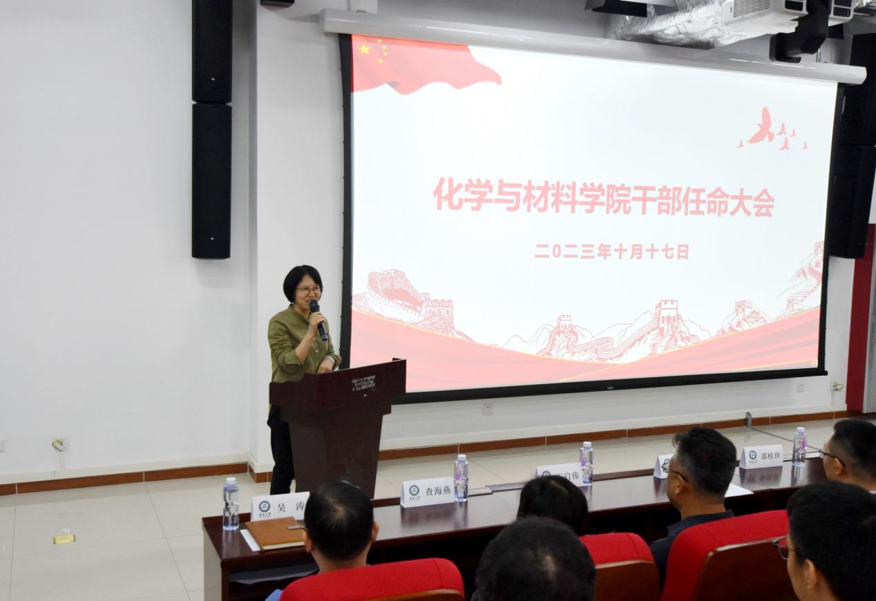 陈龙代表公司党委组织部宣读干部任命文件,经公司党委常委会研究决定,任命陈填烽同志为化学与材料公司经理,吴涛同志为化学与材料公司党委书记;因年龄关系,李丹同志不再担任球速体育经理,邵桂珍同志不再担任公司党委书记。