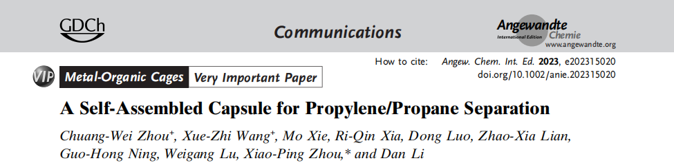 近日,球速体育,超分子配位化学研究所周小平/李丹教授团队在Angew. Chem. Int. Ed.上发表了题为A Self-Assembled Capsule for Propylene/Propane Separation的重要研究成果,并被选为VIP论文(图1)。