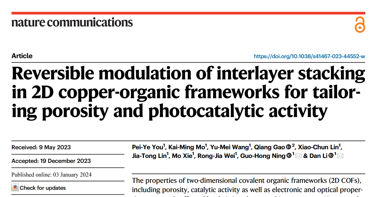 近日,球速体育宁国宏/李丹教授团队以球速体育为唯一通讯单位于2024年01月03日,在Nature Communications(IF=16.6)上发表了题为 “Reversible modulation of interlayer stacking in 2D copper-organic frameworks for tailoring porosity and photocatalytic activity” 的重要研究成果(图1)。