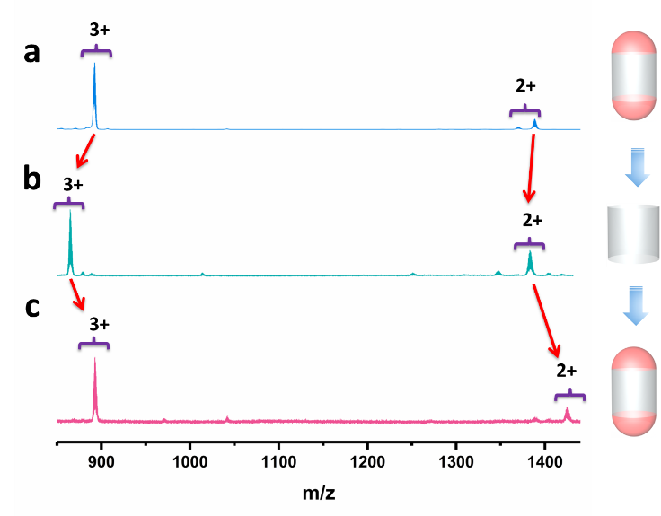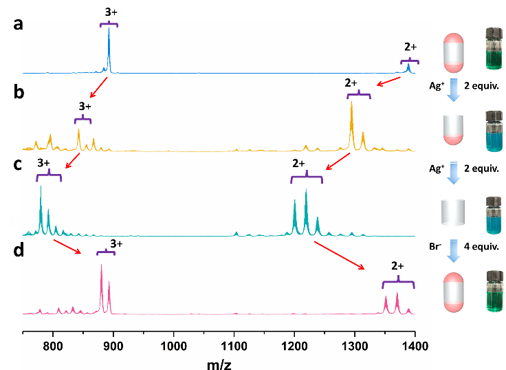 首先通过单晶X射线衍射与质谱对金属有机胶囊1-3的结构进行了表征。随后,利用质谱监测探讨了胶囊2在不同的外部刺激下的结构转化行为。发现胶囊2在过渡系金属离子(例如Ag+)的作用下,能够逐步失去两个盖状的配体L2,结构转化为单盖胶囊3与无盖胶囊1,而加入Br-沉淀Ag+后,结构能够实现可逆的转变,回到双盖胶囊2。