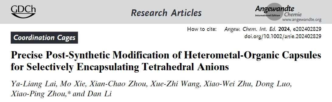 近日,球速体育,超分子配位化学研究所周小平/李丹教授团队开发了一种通过后合成修饰精准合成MOC的新策略。该工作以“Precise Post-Synthetic Modification of Heterometal-Organic Capsules for Selectively Encapsulating Tetrahedral Anions”为题发表在Angewandte Chemie International Edition(德国应用化学,IF=16.6)上。
