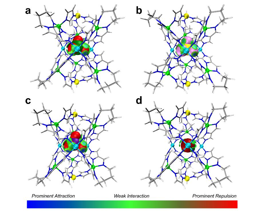 图4 计算得出的(a)ClO4-Ì2、(b)BF4-Ì2、(c)ReO4-Ì2和(d)Br-Ì2的主客体相互作用结构和IGMH表面。色标显示了相互作用强度的范围:突出的吸引力(蓝色)、微弱的相互作用(绿色)和突出的排斥力(红色)。